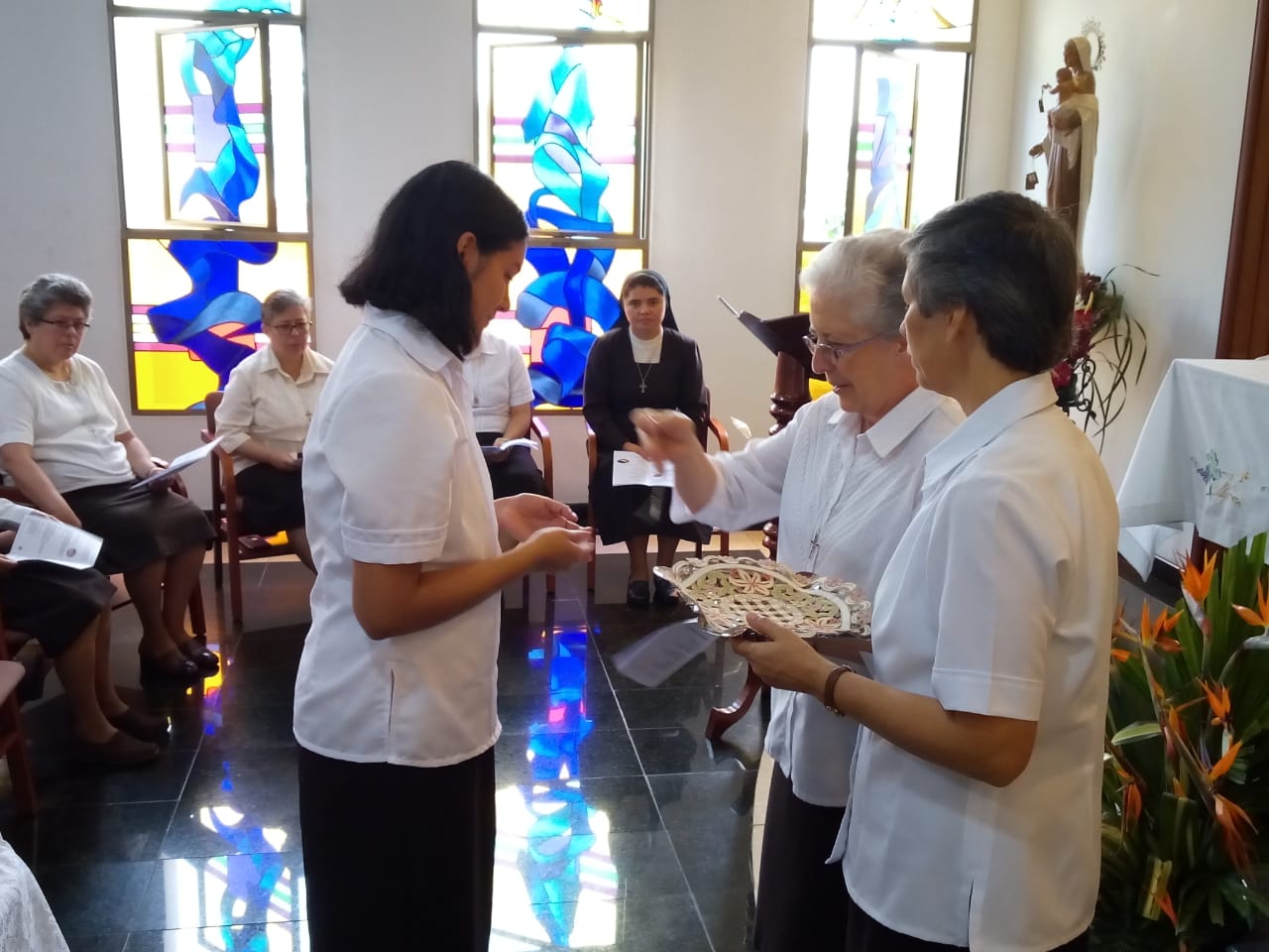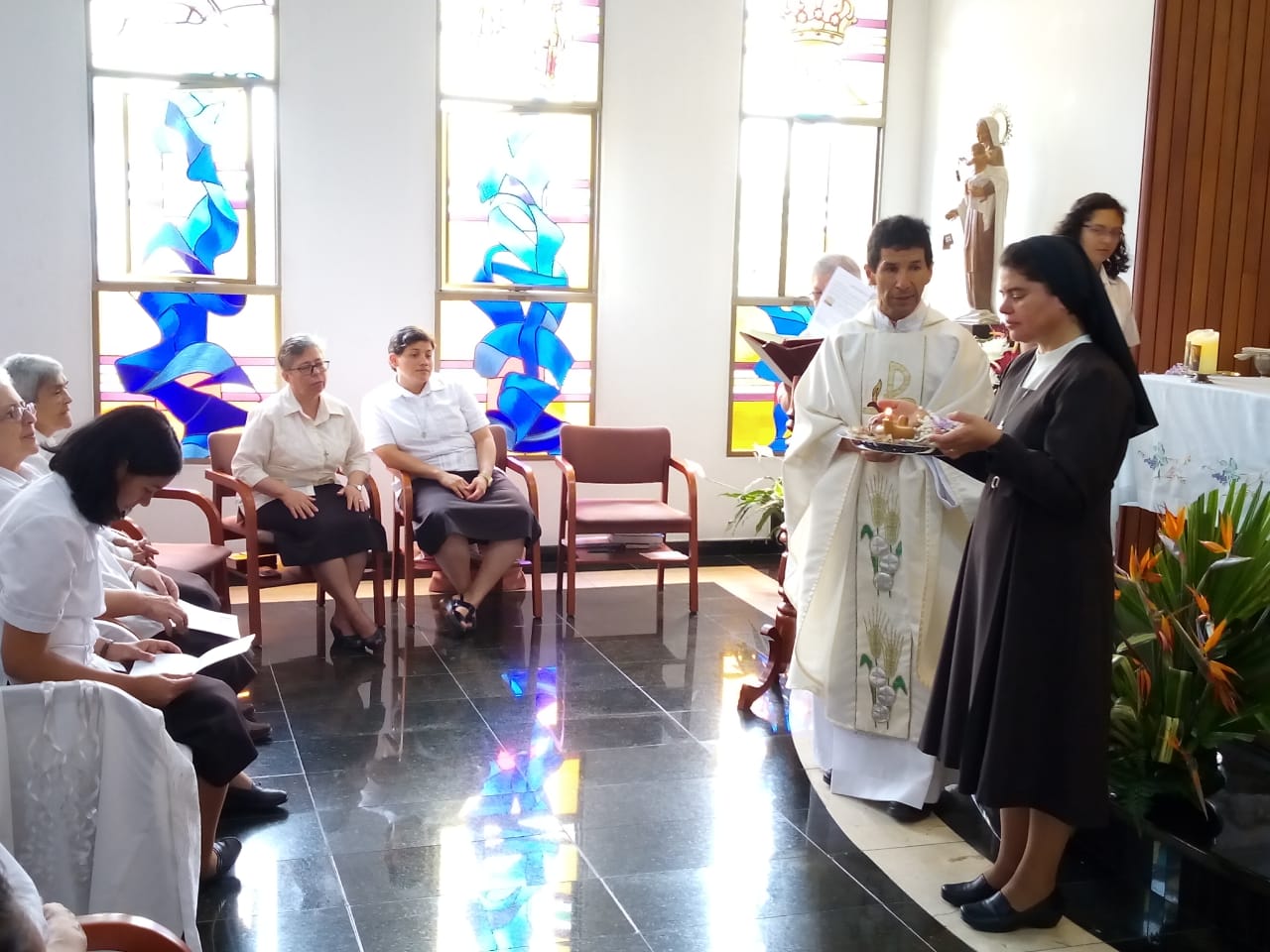 Después de ese compartir comencé a disponer el corazón para vivir la celebración de mi ingreso al noviciado. Esta celebración se realizó en compañía de quien fue mi formadora en Chile, de las Hermanas, Novicias y Postulantes presentes en Medellín ese día y en comunión con todas las Hermanas de la Congregación que me acompañaron con su oración. En todo momento me sentí muy unida a mis Hermanas de Chile. Presidió la celebración Hna. María Jesús Melón, Superiora Provincial.