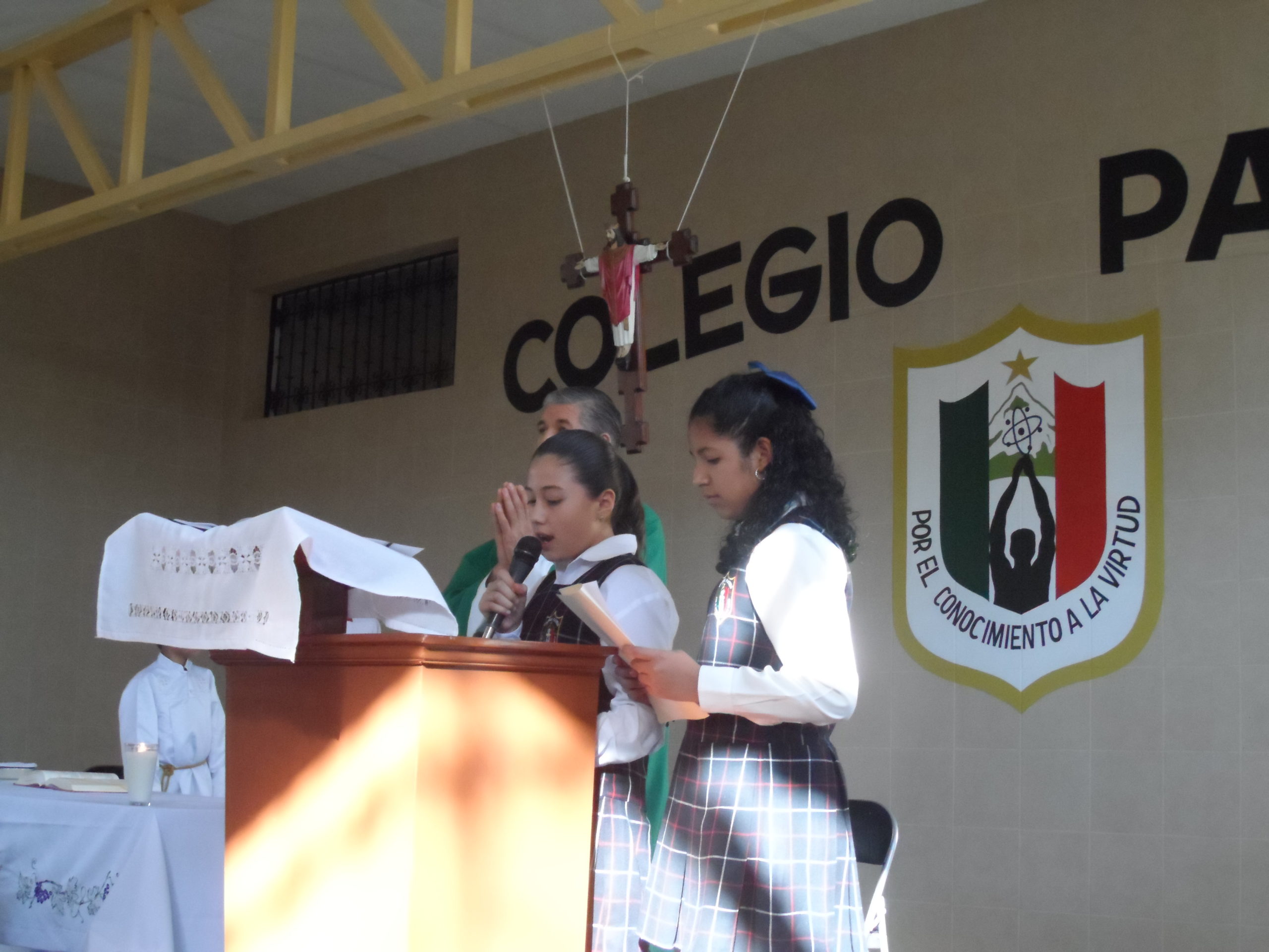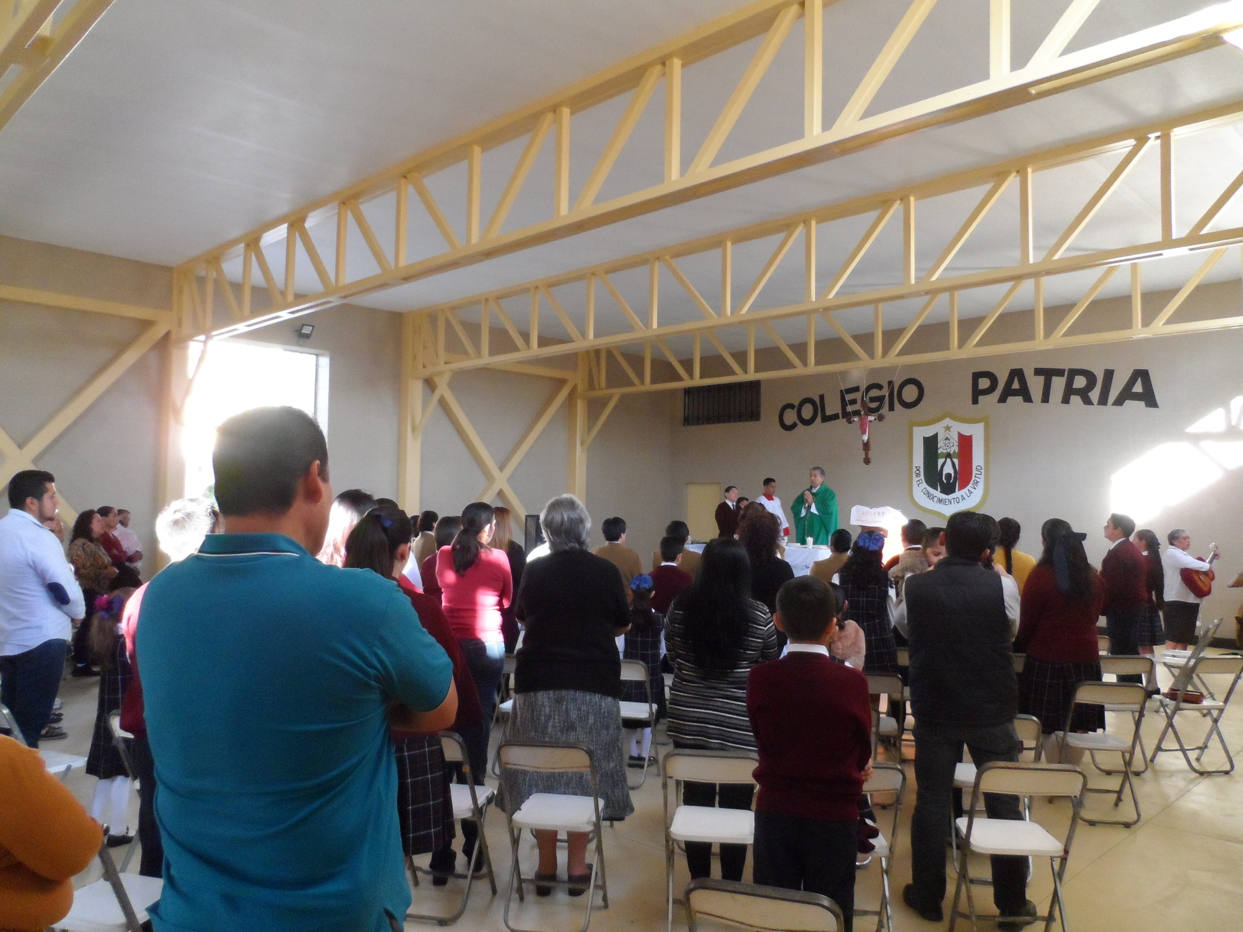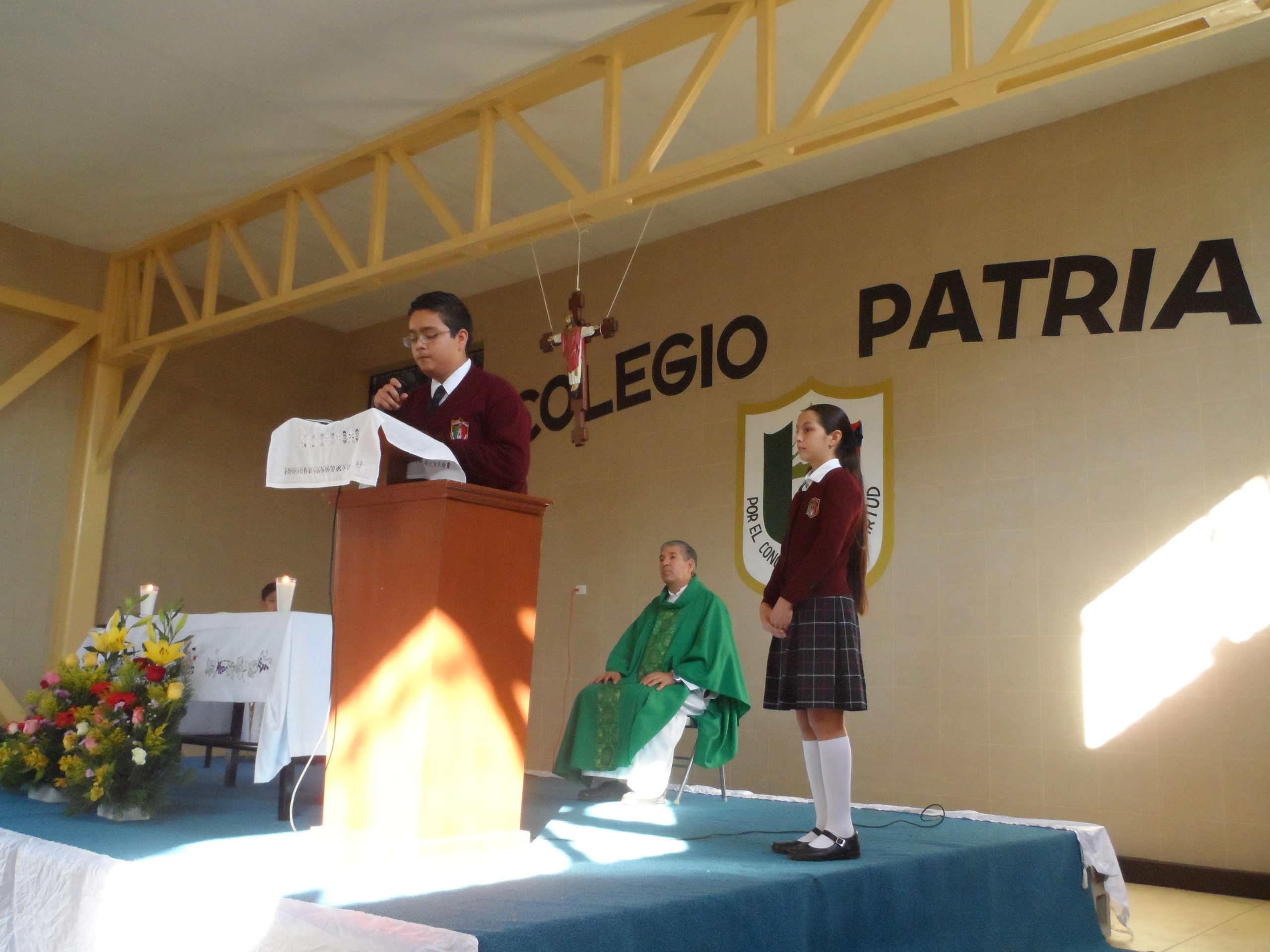 Presidió la eucaristía el Señor Cura Teodoro Ramírez Suárez, en la homilía y antes de hacer la bendición reconoció la labor incansable de las Hermanas; la hermana Cecilia también dirigió unas palabras, haciendo memoria de lo que significa para la Congregación nuestra presencia evangelizadora a través de Colegio Patria. Conmovida, reconoció la entrega generosa de las hermanas que han dado la vida en esta obra a lo largo de estos quince años. Agradeció el apoyo del Sr. Cura Teodoro y de los sacerdotes de la Parroquia, a los padres de familia que nos confían a sus hijos, a los docentes que marcan en el día a día en las aulas la calidad educativa, el trabajo callado del personal de intendencia y al personal de apoyo administrativo; se dirigió con una especial gratitud al Sr. Miguel Ángel Reyes Vázquez, quien dirigió la obra y gran parte del trabajo de mantenimiento para mejorar de las instalaciones del Colegio en estos últimos años. Manifestó también gratitud a los alumnos que representaron cada uno de los 18 grupos del Colegio, hermanas de la comunidad de Tequila que nos acompañaron, benefactores de la comunidad, y algunos fraternos.
