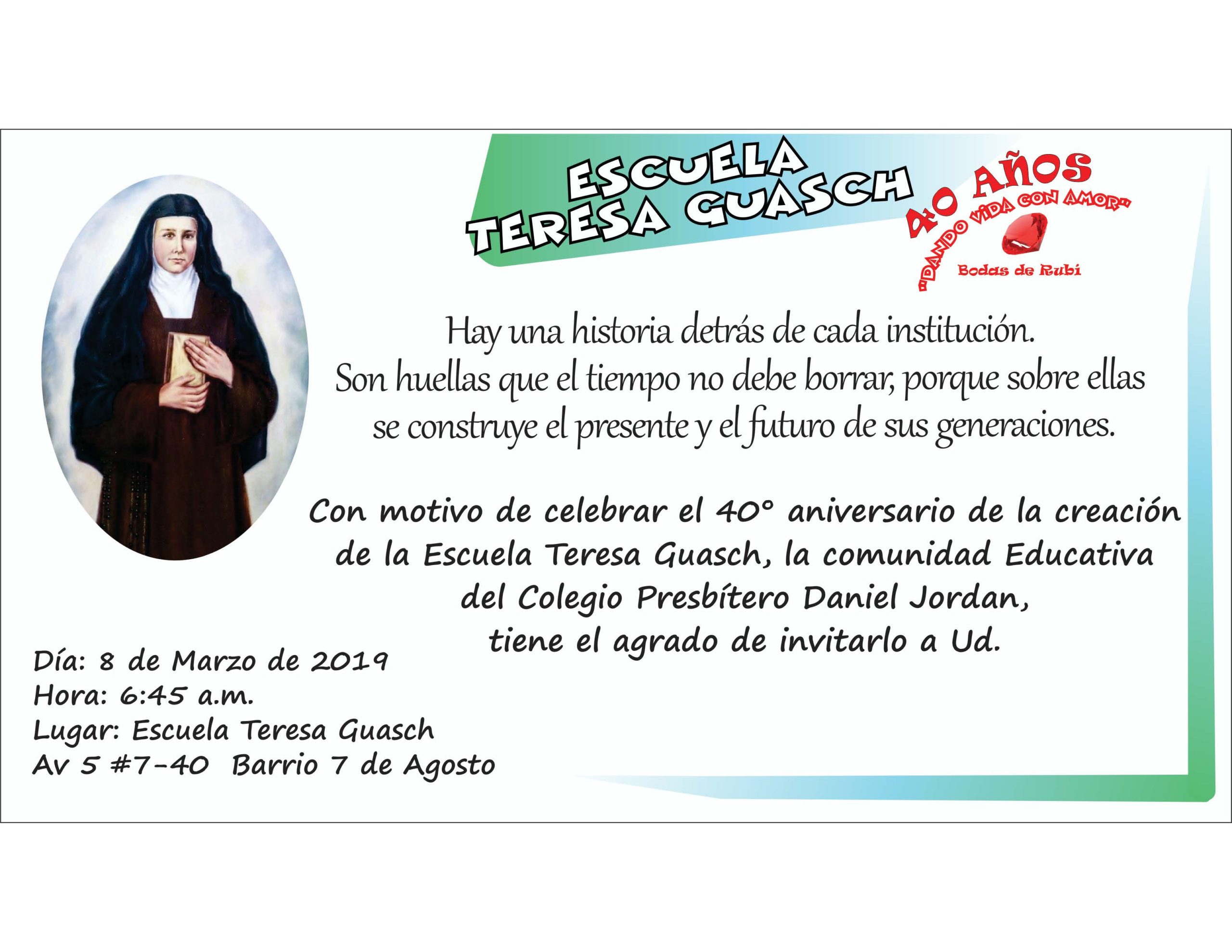 Después de los meses de trabajo, el jueves 8 de marzo de 1979 fue inaugurada y entregada a la comunidad con el nombre de TERESA GUASCH en honor a la madre fundadora de las Hermanas Carmelitas donantes de esta institución, que vieron con gran satisfacción la obra culminada y colaboración aún más para la dotación e inicio de las actividades escolares.