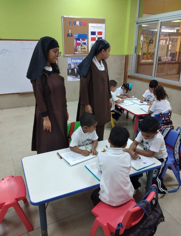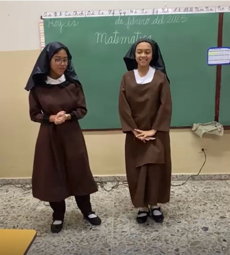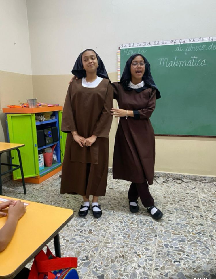 Somos Gabriela Pimentel y Christal Quirico, estudiantes de 4to y 3ero de secundaria del Colegio Santa Teresa, y queremos contarles que los días 18, 19 y 20 de febrero pasamos por el nivel inicial y primaria, personificadas de Teresa Toda y Teresa Guasch.